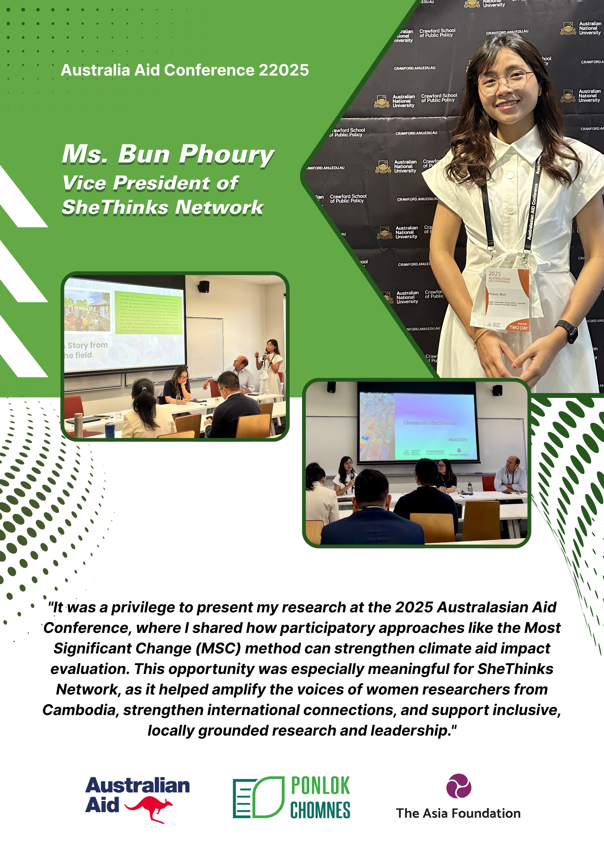 At AAC2025, Ms. Phoury presented her research on “Whose Change Counts? Rethinking Development Evaluation Through Most Significant Change in Cambodia’s Keo Seima Wildlife Sanctuary REDD + Project”​ that explores how meaningful changes experienced by local communities and interpreted through participatory evaluation methods, to inform more inclusive and contextsensitive development assessments.