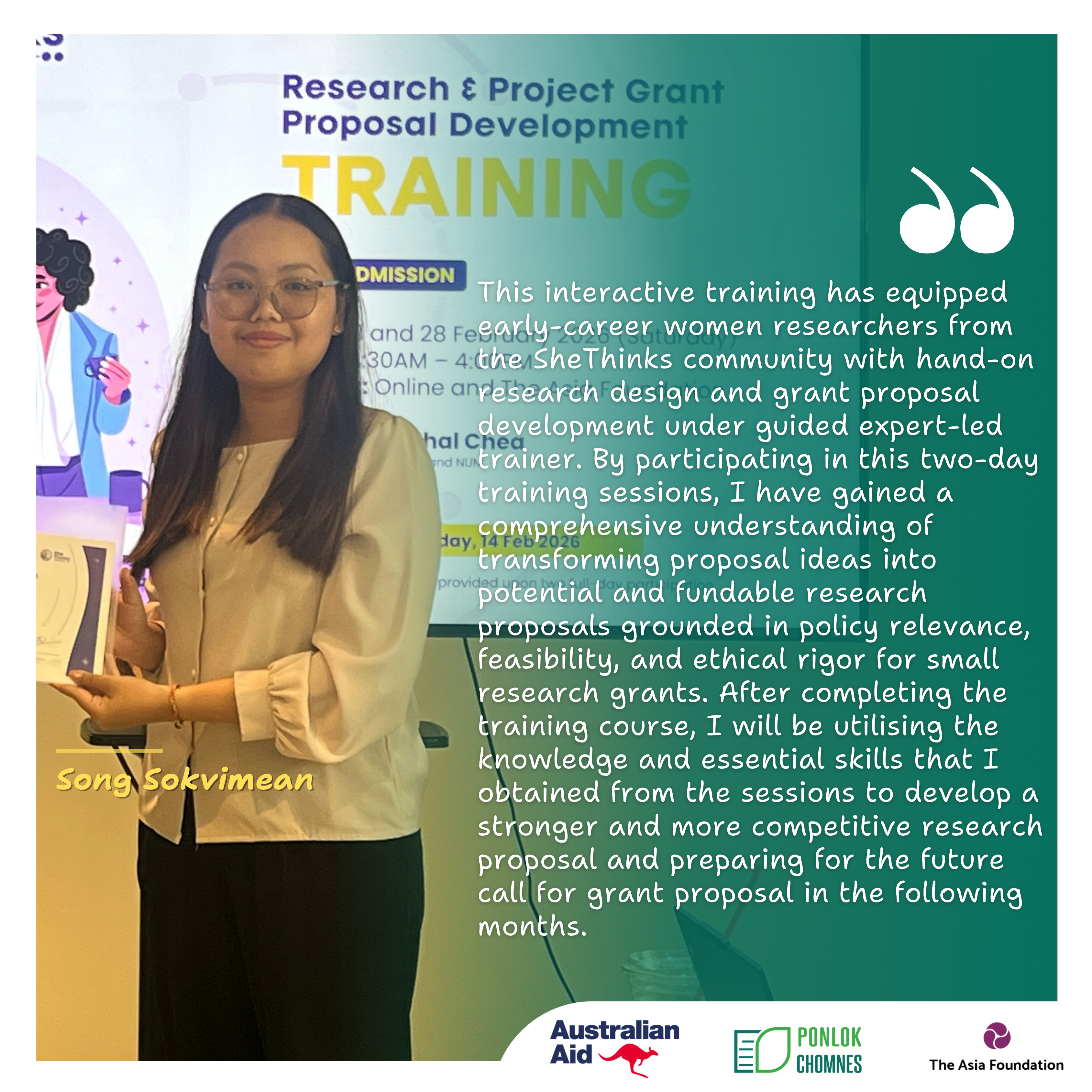 នៅថ្ងៃទី២១ ខែកុម្ភៈ និងថ្ងៃទី១៥ ខែមីនា ឆ្នាំ២០២៦ បណ្តាញស្រ្តីក្នុងវិស័យស្រាវជ្រាវបានរៀបចំវគ្គបណ្តុះបណ្តាលស្តីពី «ការអភិវឌ្ឍសំណើគម្រោងស្រាវជ្រាវ និងការស្នើសុំកញ្ចប់ថវិកា» ដែលមានគោលបំណងពង្រឹងសមត្ថភាពរបស់អ្នកស្រាវជ្រាវស្ត្រីដែលទើបចាប់ផ្តើមអាជីព ដោយជួយគាំទ្រពួកគេក្នុងការបំប្លែងចំណេះដឹងឱ្យទៅជាការអនុវត្តជាក់ស្តែង។