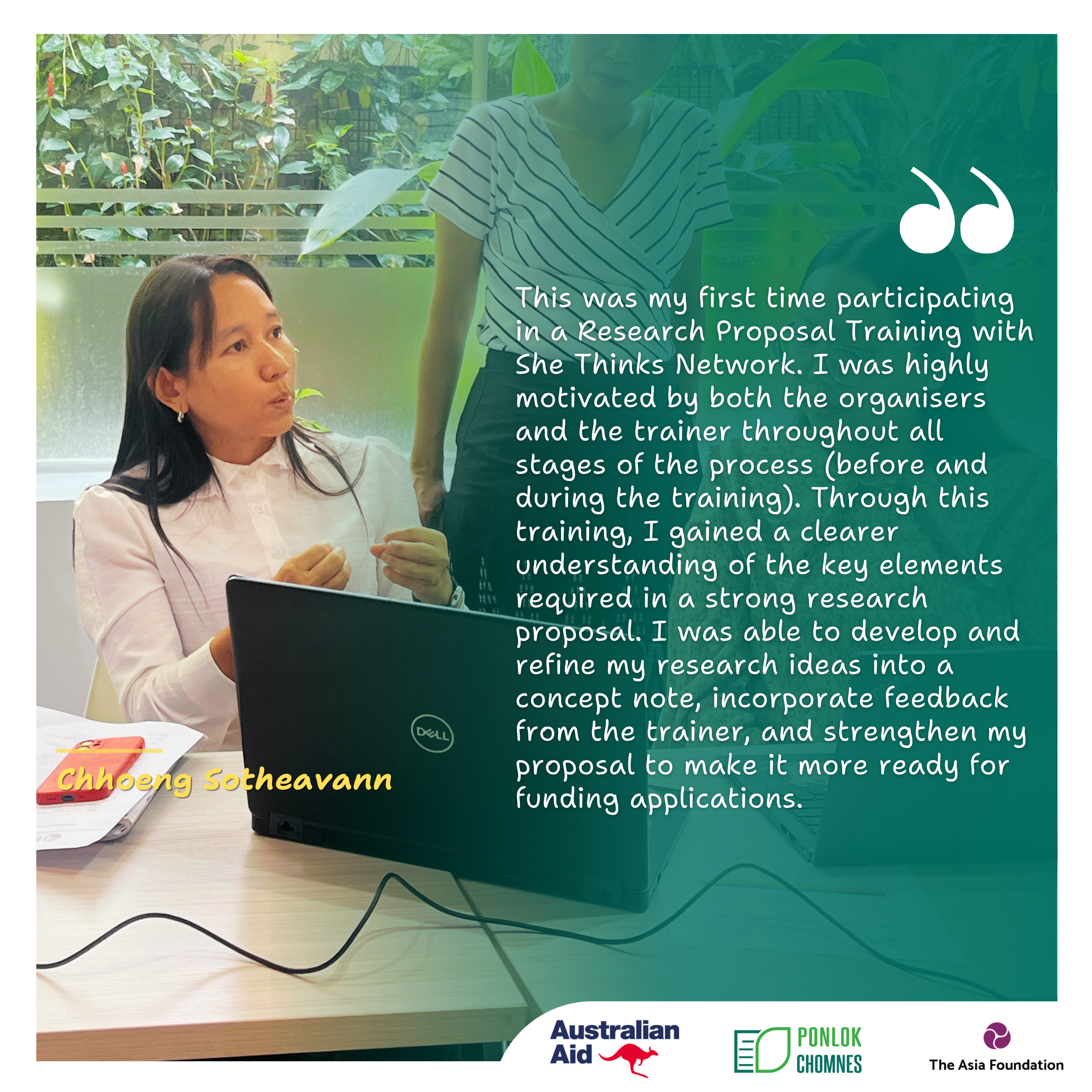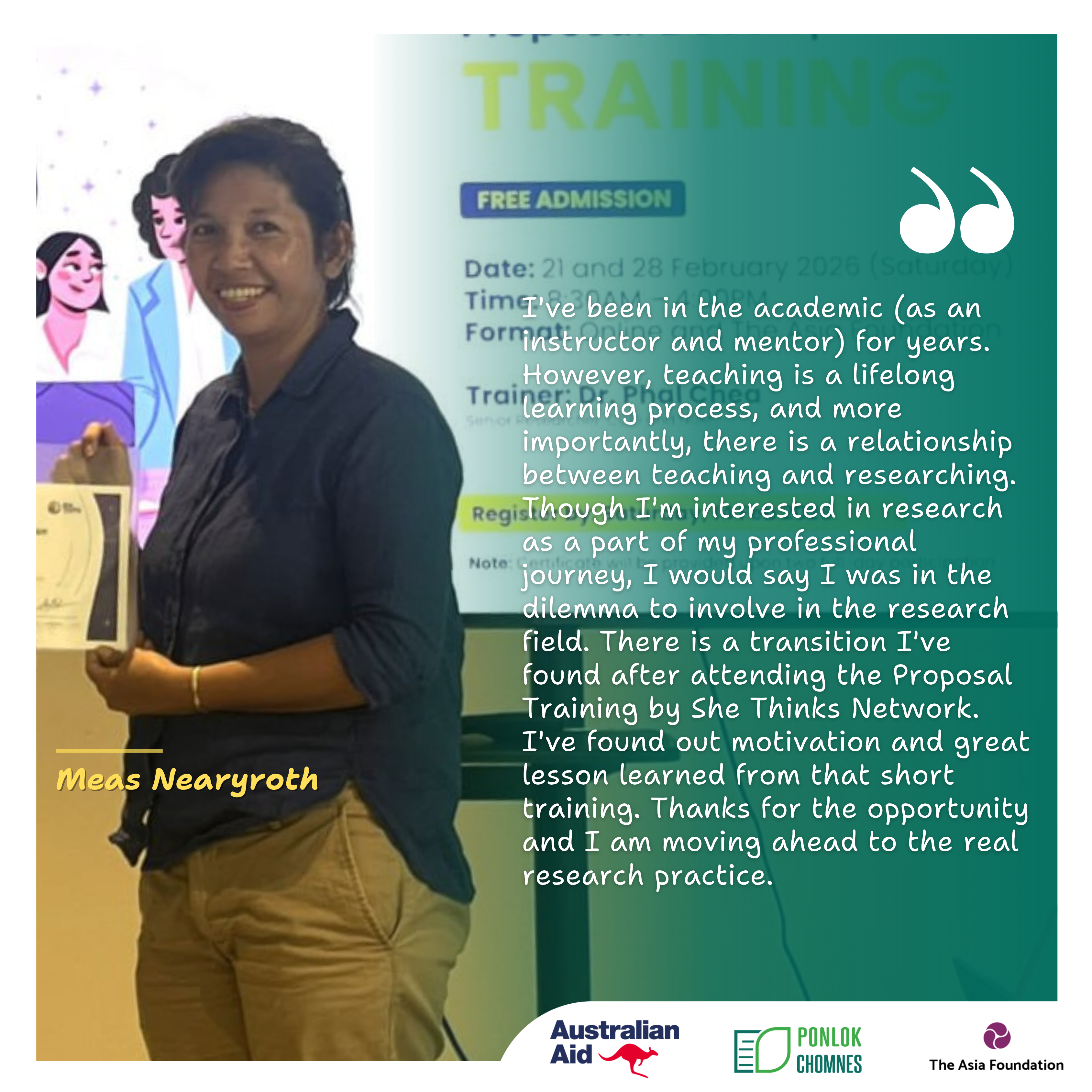 ការបណ្តុះបណ្តាលនេះគឺជាផ្នែកមួយនៃកិច្ចខិតខំប្រឹងប្រែងរបស់បណ្តាញ ក្នុងការលើកកម្ពស់ការបង្កើត និងការផ្សព្វផ្សាយចំណេះដឹង ដោយគាំទ្រដល់អ្នកស្រាវជ្រាវស្ត្រីក្នុងការស្រាវជ្រាវដែលមានគុណភាពខ្ពស់ និងចូលរួមចំណែកយ៉ាងសកម្មដល់ការរៀបចំគោលនយោបាយផ្អែកលើទិន្នន័យ។
